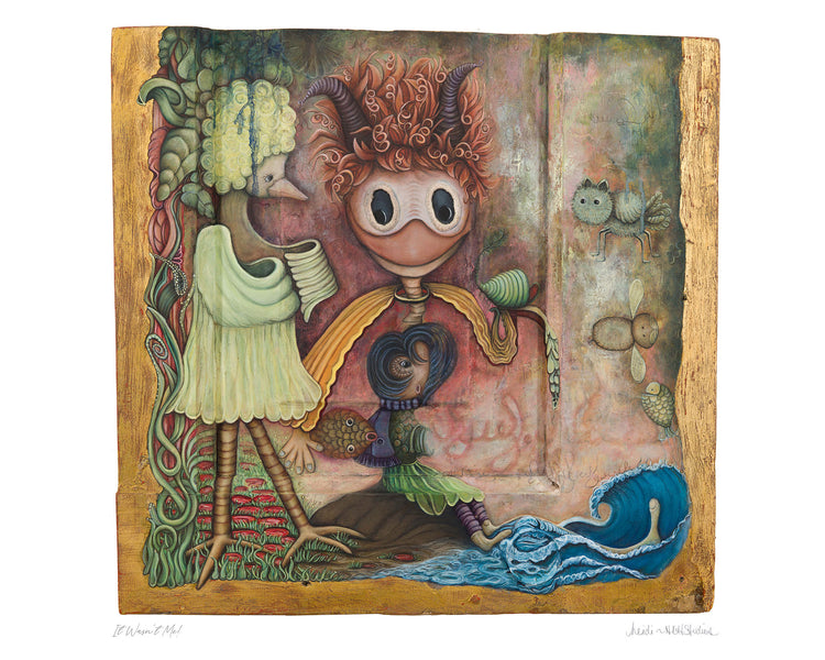 My images are reproduced according to the scale/proportions of the original painting. Therefore, each print will have around a 1/2" white border (maybe more depending on the original proportions of the painting) on the top, sides, and bottom. The title of the painting and my studio name are printed underneath the image. Your order will arrive packaged in a protective stiff mailer.