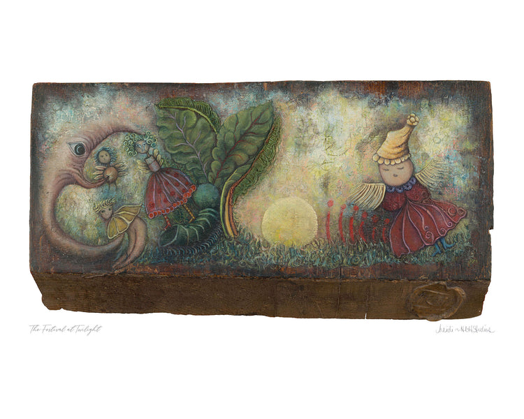 This work was inspired by the tiny residents we may not always see in the garden - bugs, fairies, and so many more. This painting is from my Stories on Wood Collection.