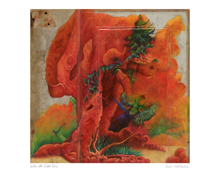 This was my very 1st painting on a piece of an old door. This 1st door cost me $5 at the ReUse It Center years ago and was the perfect shade of worn grey with tons of character and history. When the Tickle Turns was prompted by a walk in the woods and thinking what a delight if one could see an actual tickle turn amongst the trees. This painting is from my Stories on Wood Collection.