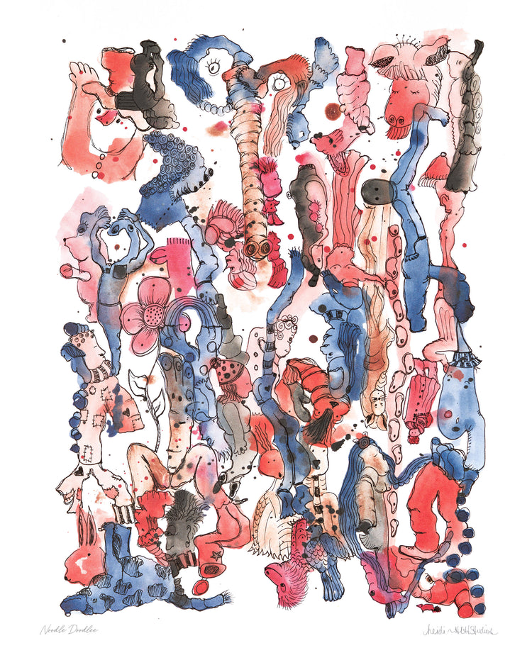 My images are reproduced according to the scale/proportions of the original doodle. Therefore, each print will have around a 1/2" white border (maybe more depending on the original proportions of the doodle) on the top, sides, and bottom. The title of the doodle and my studio name are printed underneath the image. Your order will arrive packaged in a protective stiff mailer.